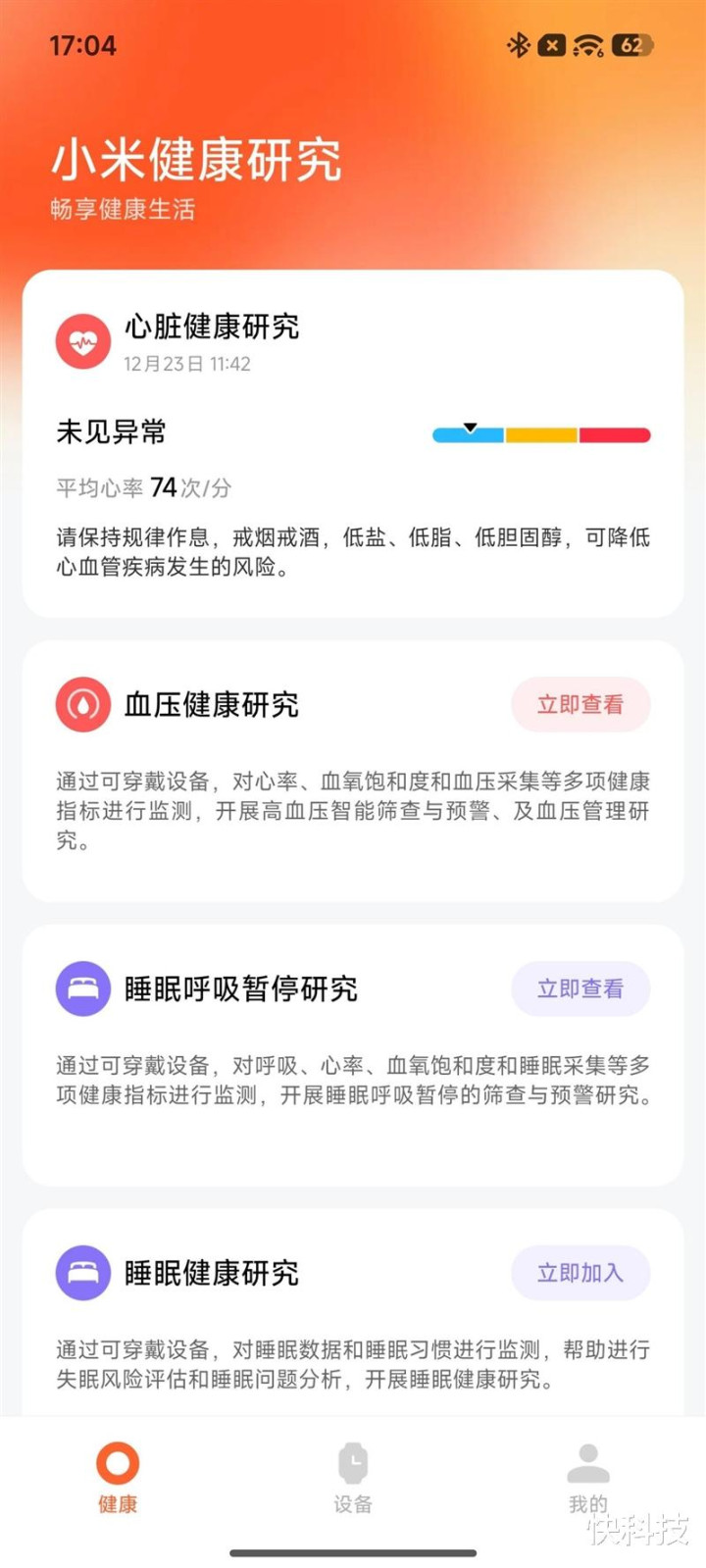 除了ECG专业心电分析之外,小米健康研究APP中还提供了血压健康研究,睡眠健康研究等功能。