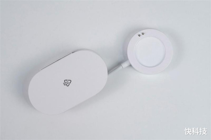 磁吸充电器特写,通过磁吸定位,两个镀金触电自动对齐手表背面的充电触点进行充电,由于手表电池较小,只支持10W充电,所以采用了USB-A的线缆。